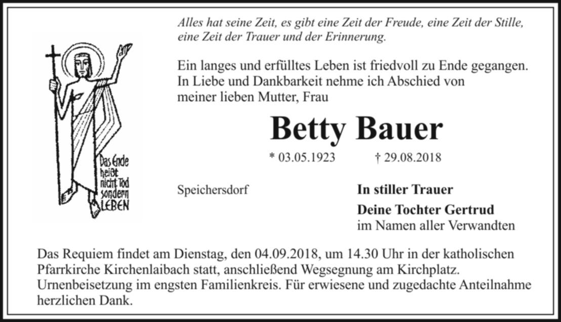 Das Requiem findet am Dienstag, den 04.09.2018, um 14.30 Uhr in der katholischen Pfarrkirche Kirchenlaibach statt, anschließend Wegsegnung am Kirchplatz.