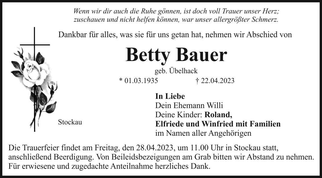 Die Trauerfeier findet am Freitag, den 28.04.2023, um 11.00 Uhr in Stockau statt, anschließend Beerdigung. Von Beileidsbezeigungen am Grab bitten wir Abstand zu nehmen. Für erwiesene und zugedachte Anteilnahme herzliches Dank.