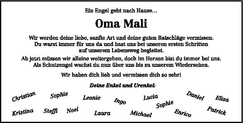 Besonders danken wir dem Hausarzt Dr. Cronenberg mit Team und der Tagespflege „Senta“ für die liebevolle Betreuung.