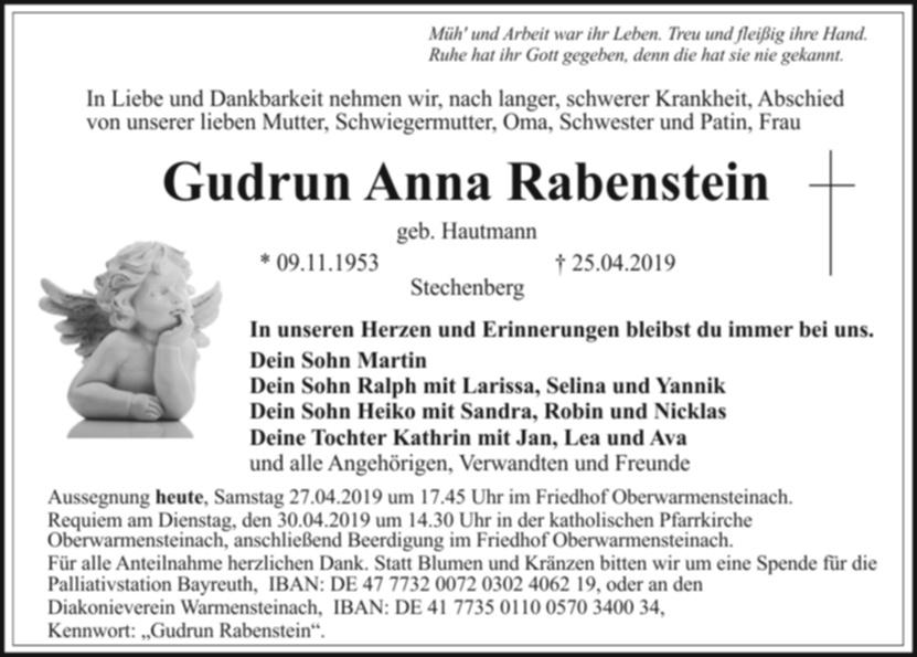 Aussegnung am Samstag, den 27.04.2019, um 17.45 Uhr im Friedhof Oberwarmensteinach.