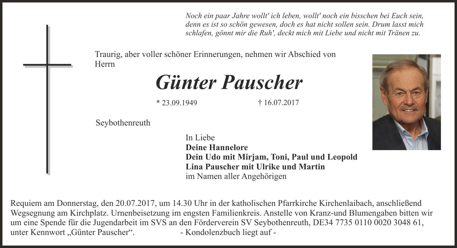 Requiem am Donnerstag, den 20.07.2017, um 14.30 Uhr in der katholischen Pfarrkirche Kirchenlaibach, anschließend Wegsegnung am Kirchplatz. Urnenbeisetzung im engsten Familienkreis. Anstelle von Kranz-und Blumengaben bitten wir um eine Spende für die Jugendarbeit im SVS an den Förderverein SV Seybothenreuth, DE34 7735 0110 0020 3048 61, unter Kennwort „Günter Pauscher“. - Kondolenzbuch liegt auf -
