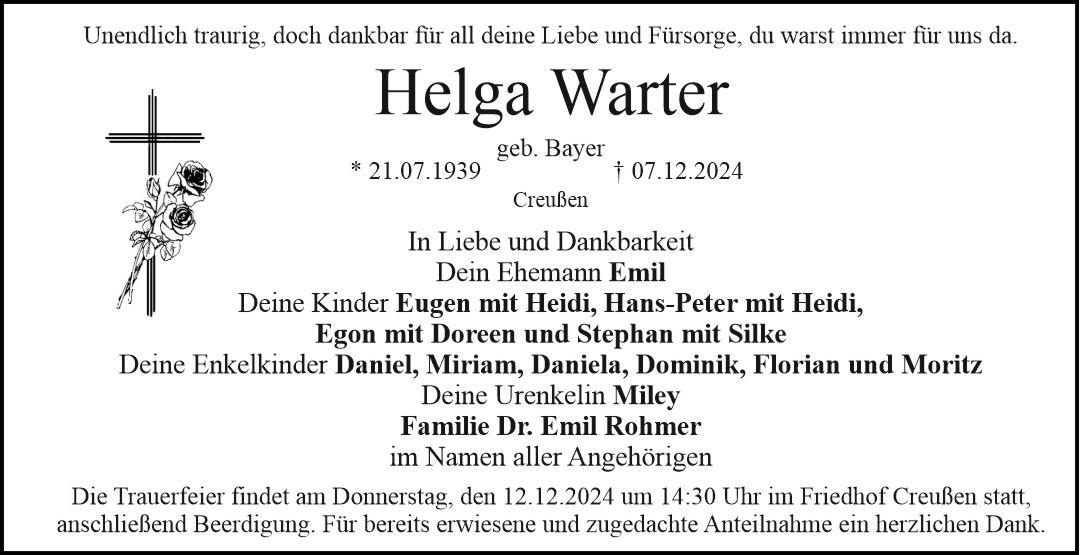Die Trauerfeier findet am Donnerstag, den 12.12.2024 um 14:30 Uhr im Friedhof Creußen statt, anschließend Beerdigung. Für bereits erwiesene und zugedachte Anteilnahme ein herzlichen Dank