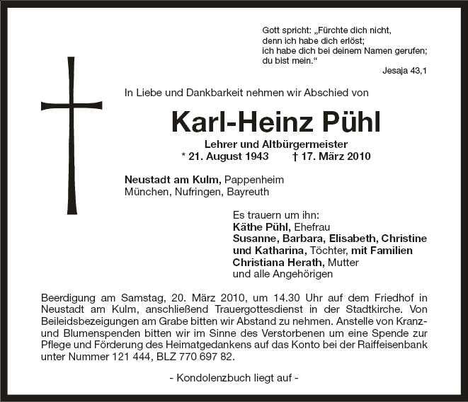 Die Beisetzung findet am 20.03.2010 um 14.30 Uhr auf dem Friedhof in Neustadt am Kulm statt.