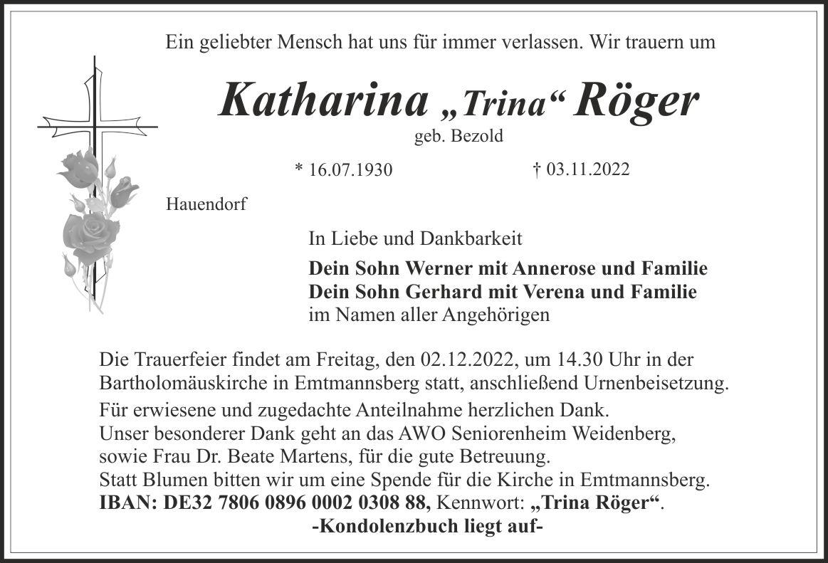IBAN: DE32 7806 0896 0002 0308 88, Kennwort: „Trina Röger“. -Kondolenzbuch liegt auf-