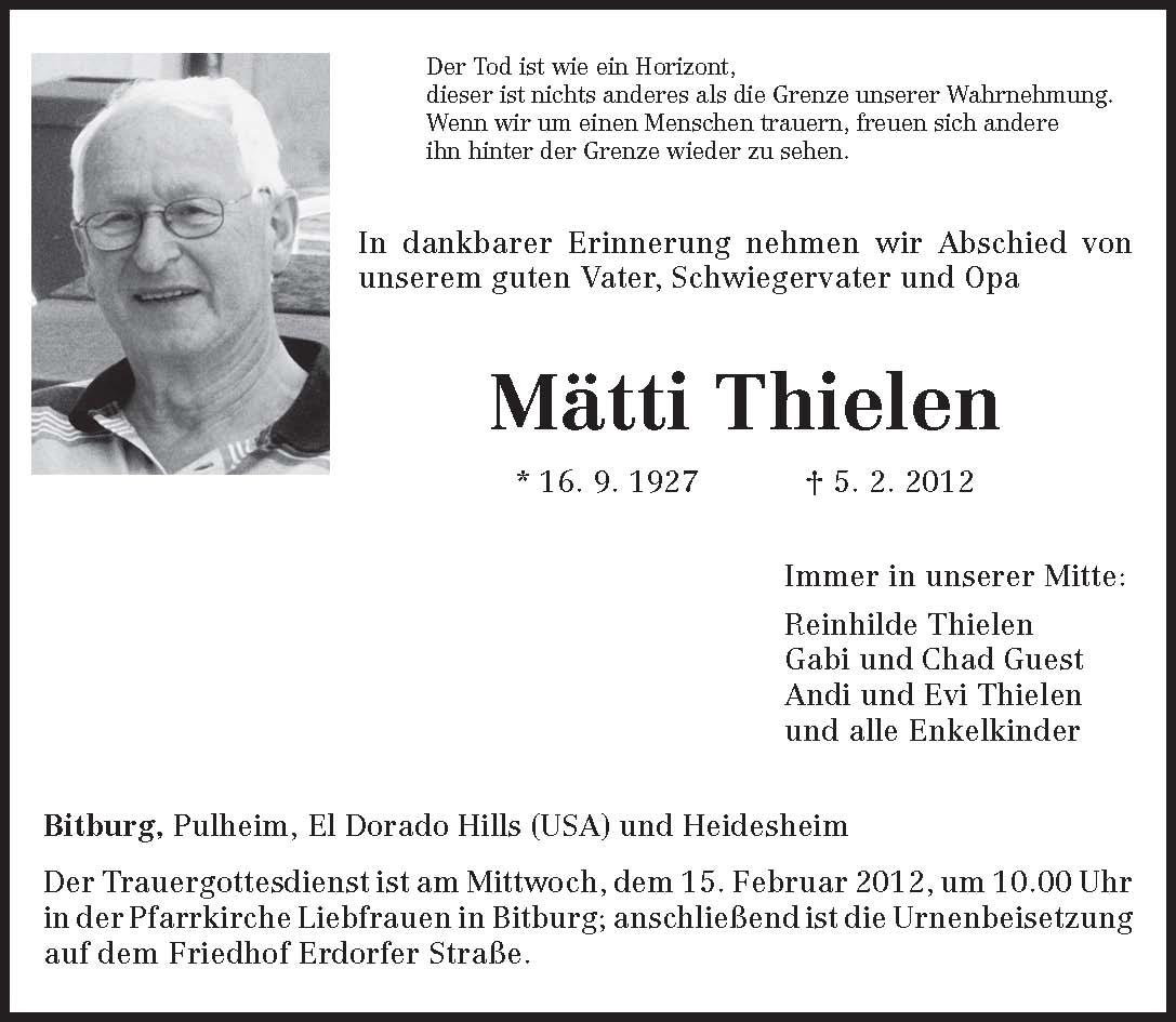 Trauergottesdienst am Mittwoch, den 11.03.2015 um 14.00 Uhr in Wirbenz, anschließend Beerdigung.