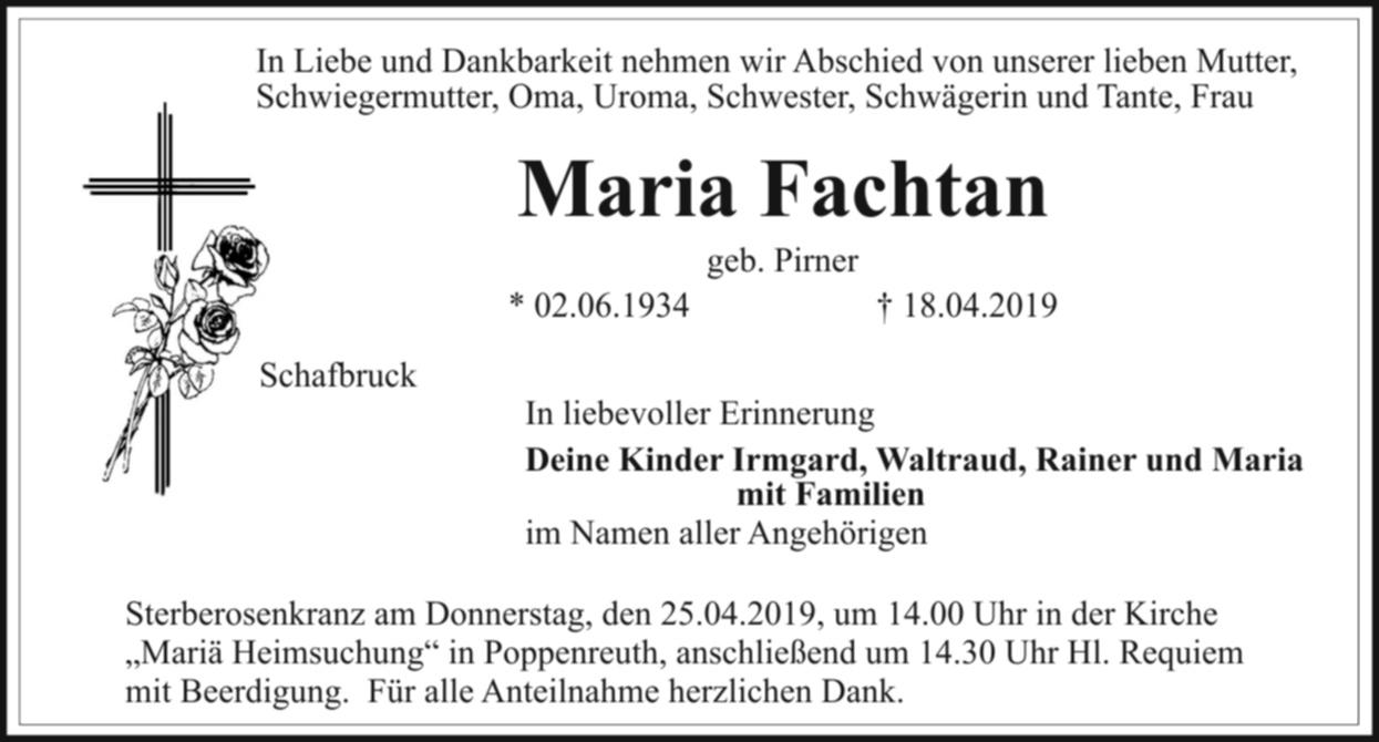 Sterberosenkranz am Donnerstag, den 25.04.2019, um 14.00 Uhr in der Kirche „Mariä Heimsuchung“ in Poppenreuth, anschließend um 14.30 Uhr Hl. Requiem mit Beerdigung. Für alle Anteilnahme herzlichen Dank.