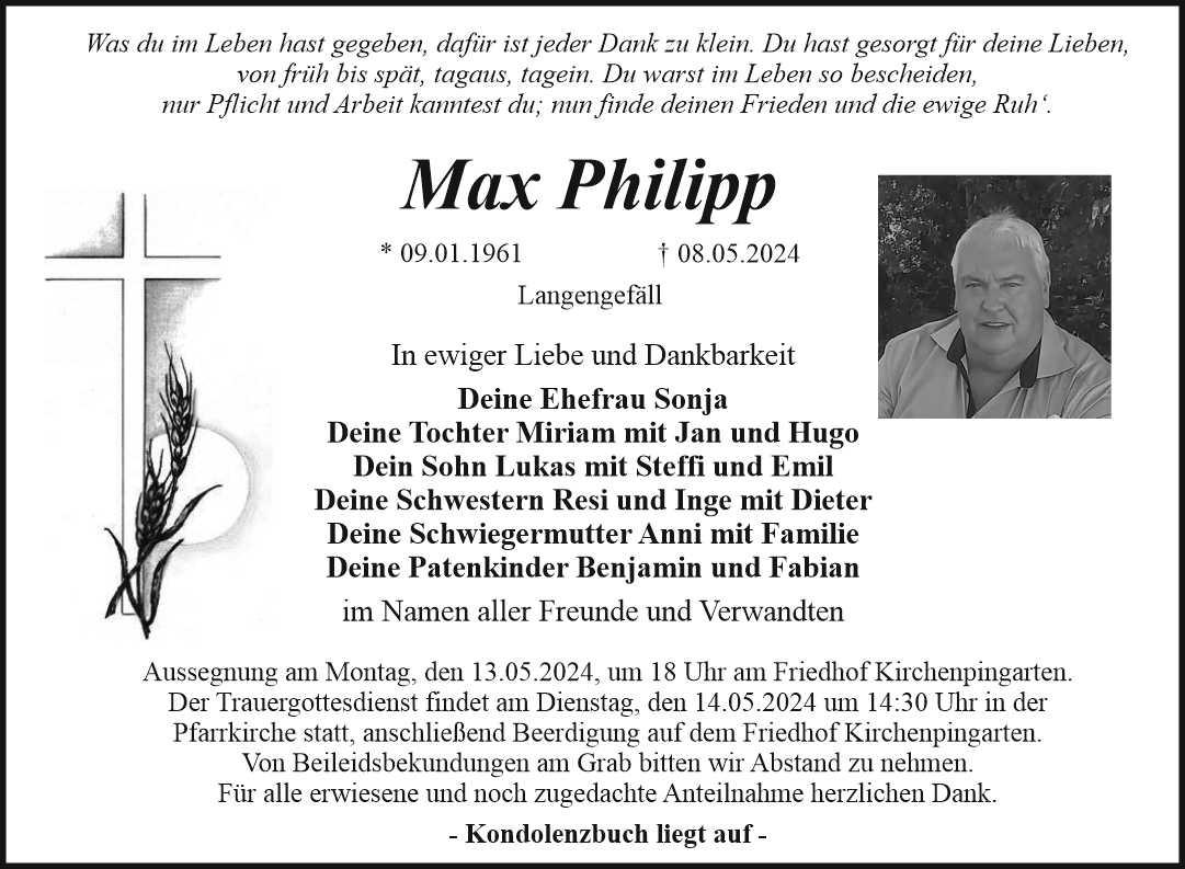 Aussegnung am Montag, den 13.05.2024, um 18 Uhr am Friedhof Kirchenpingarten.