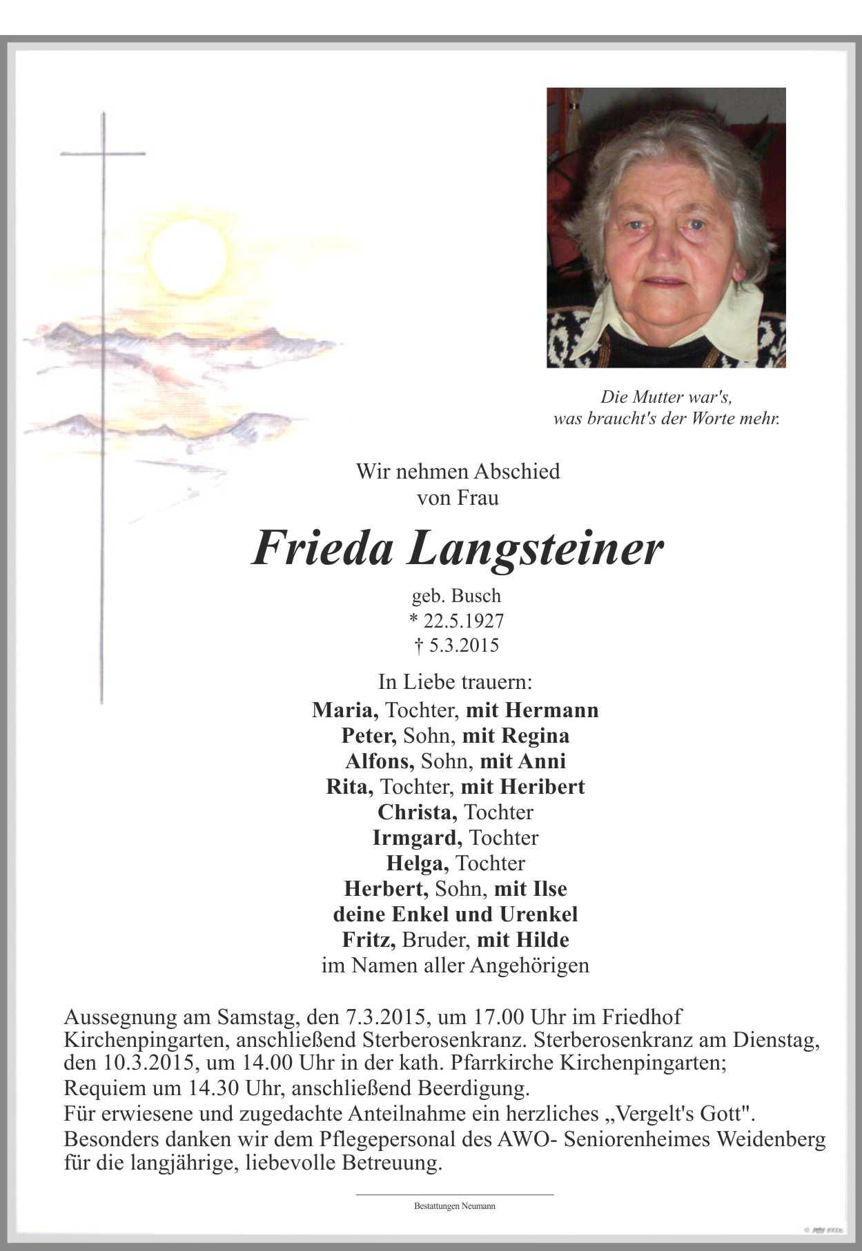 Die Trauerfeier mit anschließender Urnenbeisetzung findet am Freitag,