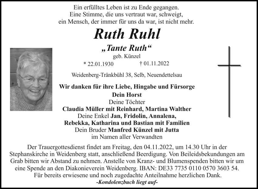 Der Trauergottesdienst findet am Freitag, den 04.11.2022, um 14.30 Uhr in der Stephanskirche in Weidenberg statt, anschließend Beerdigung. Von Beileidsbekundungen am Grab bitten wir Abstand zu nehmen. Anstelle von Kranz- und Blumenspenden bitten wir um eine Spende an den Diakonieverein Weidenberg. IBAN: DE33 7735 0110 0570 3603 54.