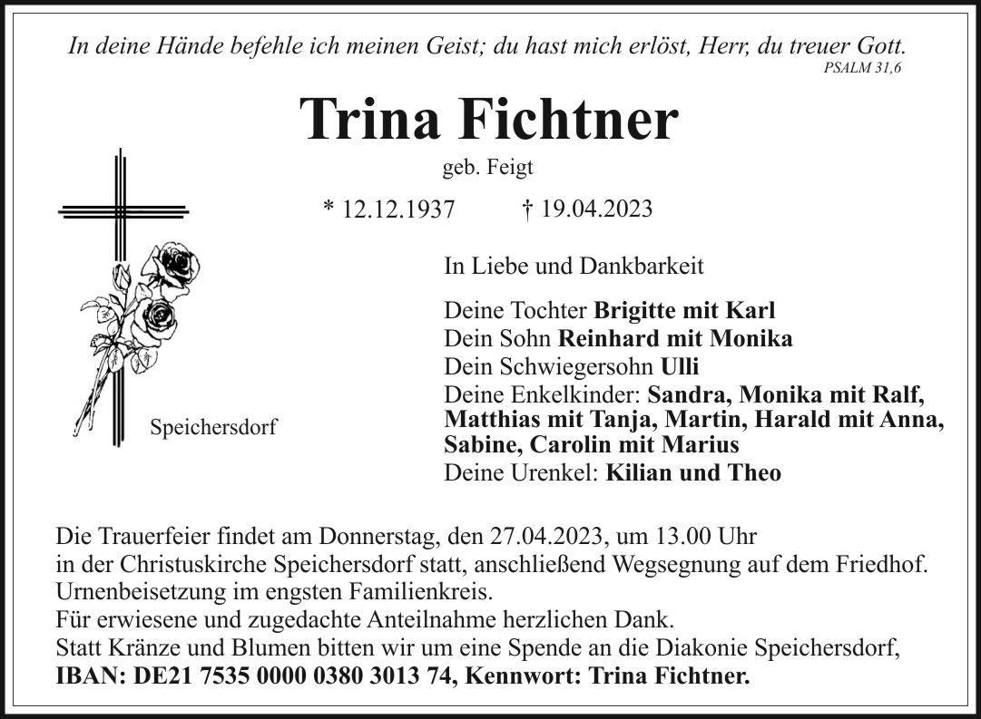 IBAN: DE21 7535 0000 0380 3013 74, Kennwort: Trina Fichtner.