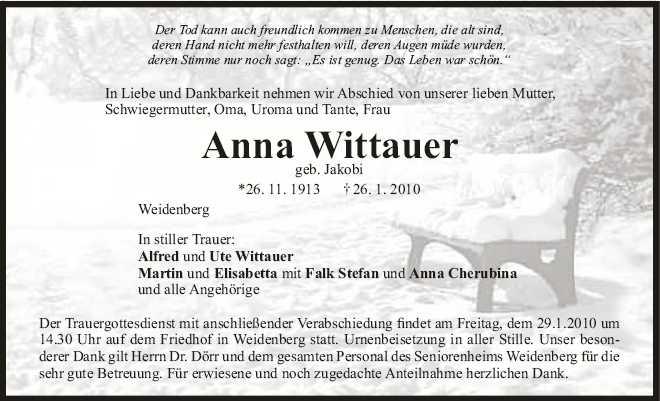 Der Trauergottesdienst findet am Dienstag, dem 21.9.2010 um 13.00 Uhr in der Gottesackerkirche in Bayreuth statt, anschließend Beerdigung am Stadtfriedhof. Von Beileidsbezeigungen bitten wir Abstand zu nehmen.